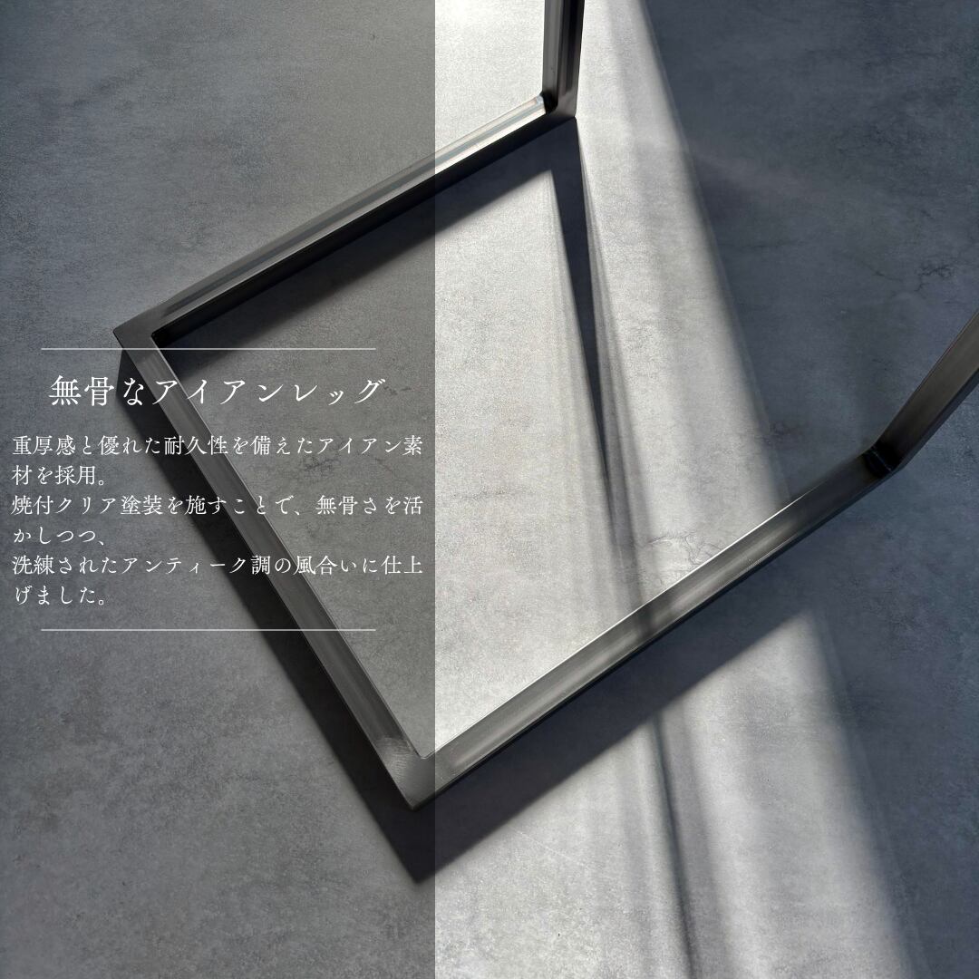 脚には、重厚感と耐久性に優れたアイアン素材を採用。さらに、焼付クリア塗装を施すことで、無骨さを活かしながらも洗練されたアンティークな風合いに仕上げました。