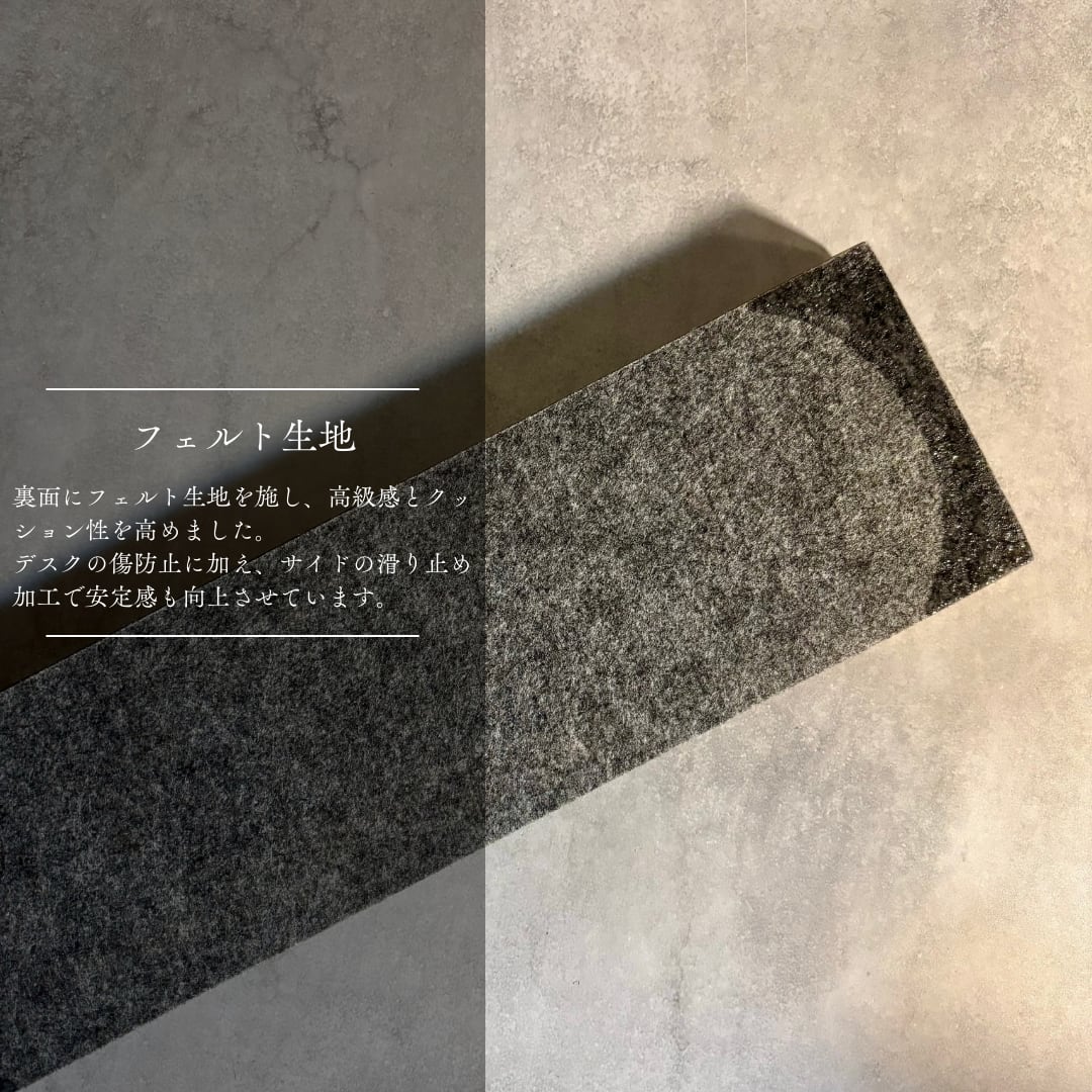 このアームレストには、無垢の木材とフローレスレジンを使用しています。裏面にはフェルト生地を施し、高級感とクッション性をプラスしました。デスクの傷を防ぐだけでなく、サイドの滑り止め加工により安定感も向上させています。