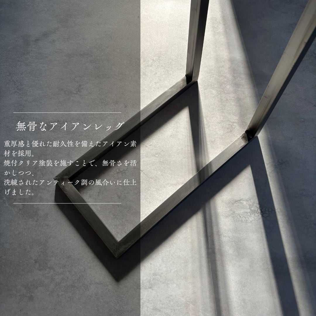 脚には、重厚感と耐久性に優れたアイアン素材を採用。さらに、焼付クリア塗装を施すことで、無骨さを活かしながらも洗練されたアンティークな風合いに仕上げました。