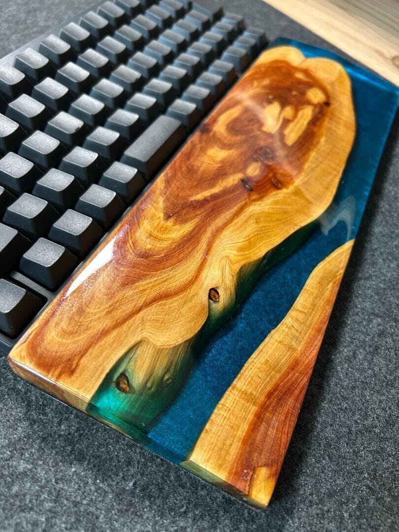 このアームレストには、無垢の木材とフローレスレジンを使用しています。レジンのカラーはクリアブルーです。また表面はレジンでコーティングしており、水や汚れから木材をしっかりと保護。