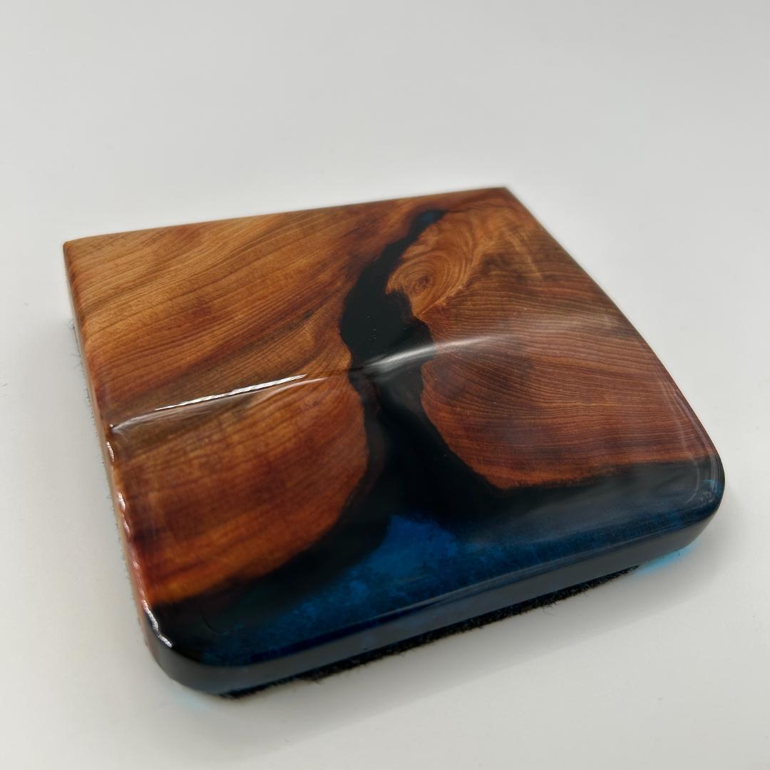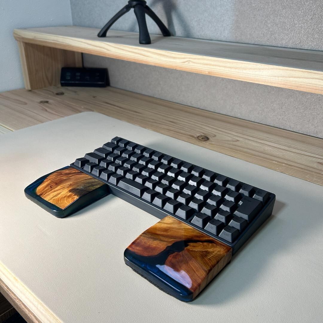屋久杉の木材で分離型アームレスト、パームレストを作ってみました!屋久杉をクリアブルーのレジンとかけ合わせています。無垢材となりますので、同一のデザインはできません。