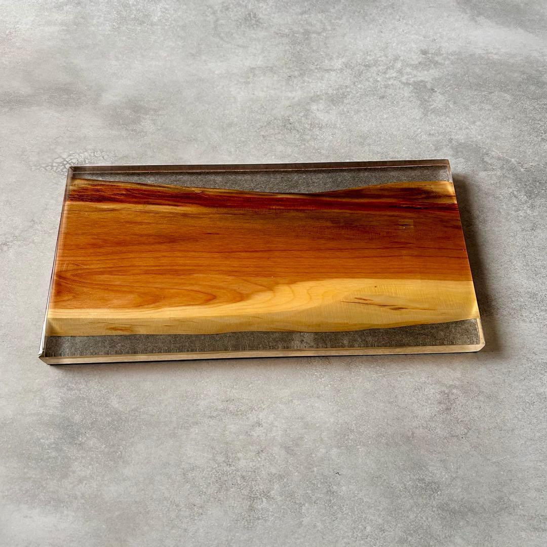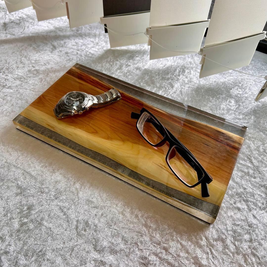 美しい木目を持つ木材と洗練された輝きを放つレジンで織りなすウッドレジン製の飾り台です。小さな工房で丁寧に仕上げた一点物になります。裏面にはオリジナルのロゴを施しています。