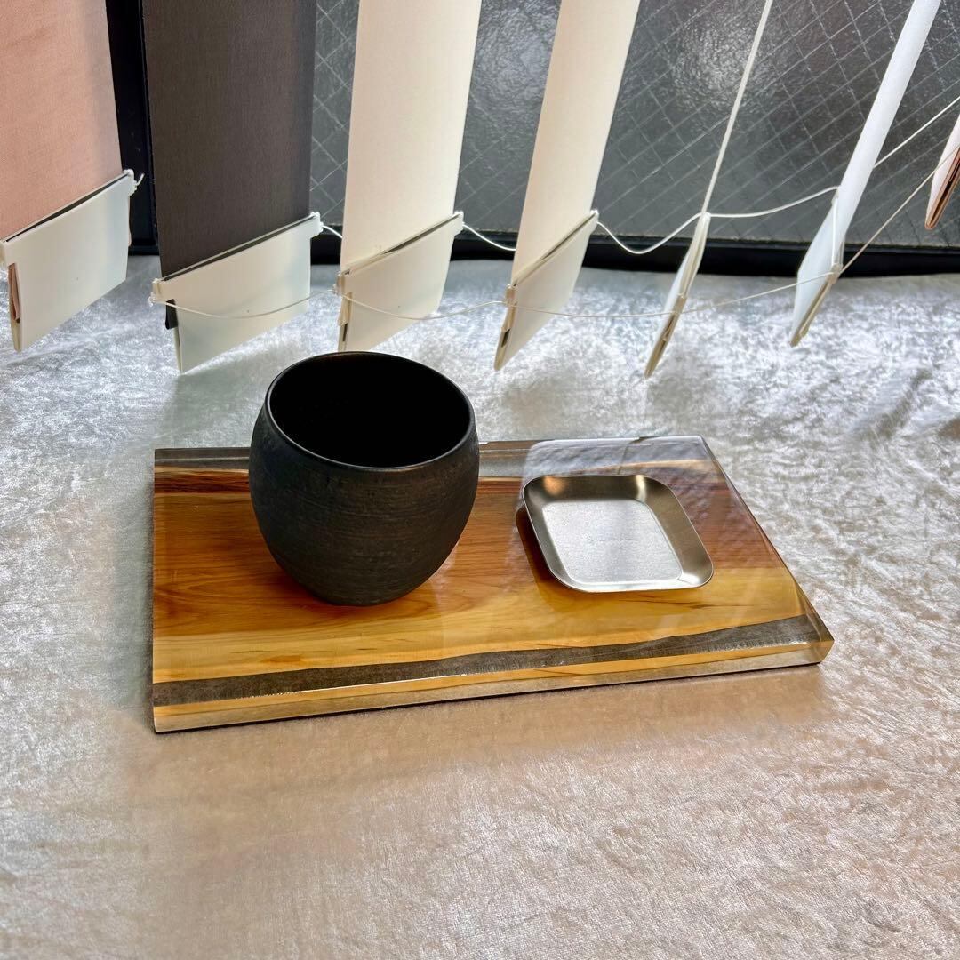 この飾り台には、無垢の木材とフローレスレジンを使用しています。使用している木材には、日本では「一位」と書かれ、古くから高貴な木として尊ばれてきた「一位(イチイ)」を採用しました。緻密でなめらかな木肌と、美しい赤みを帯びた色合いが魅力です。表面はレジンでコーティングしており、水や汚れから木材をしっかりと保護。裏面はあえて無塗装に仕上げることで、木材本来のなめらかな質感をお楽しみいただけます。